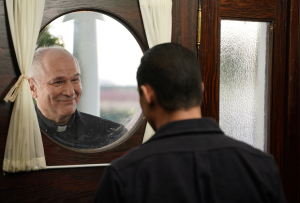 Another dumb thing that happens is that Ronald answers his doorbell. Imagine seeing your picture in the paper, knowing the cops are searching for you, and then answering the friggin’ doorbell just like it’s any regular day. The man at the door is Ronald’s mother’s priest. How do we know? He just so happens to be wearing a white collar and carrying a bible. Ronald shouldn’t let this priest into the house. After all, he has a kidnapped boy in the basement who is able to make plenty of noise despite the masking tape on his mouth. And, of course, Ronald should be suspicious that our man of God may have seen him in the newspaper.