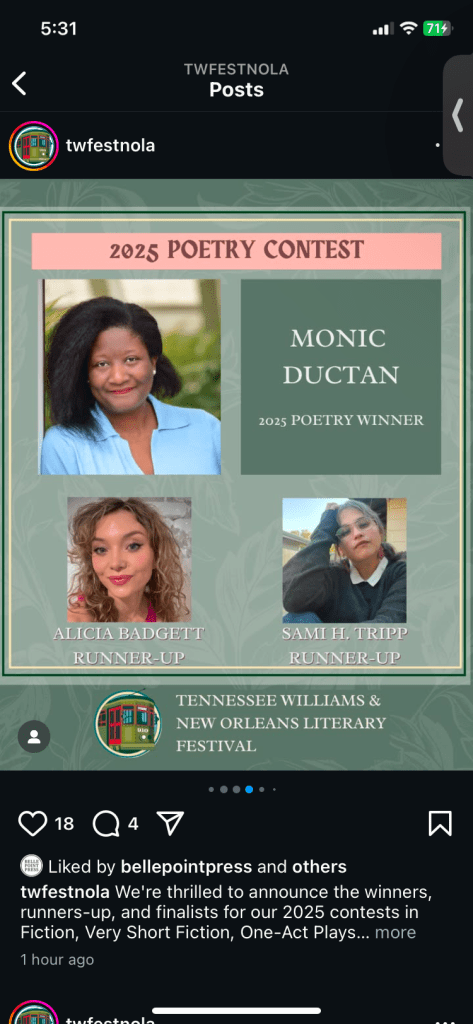 Y’all, I’m the proud winner of the Tennessee Williams/New Orleans Literary Festival Contest in the poetry category. The prize is $1,000 and it’s the most I’ve ever received for a single poem. I’m also invited to read at the festival on March 30th. Congrats to all finalists, and thanks to the judges and the festival committee. Yay! 🍾🎉🎈🎊